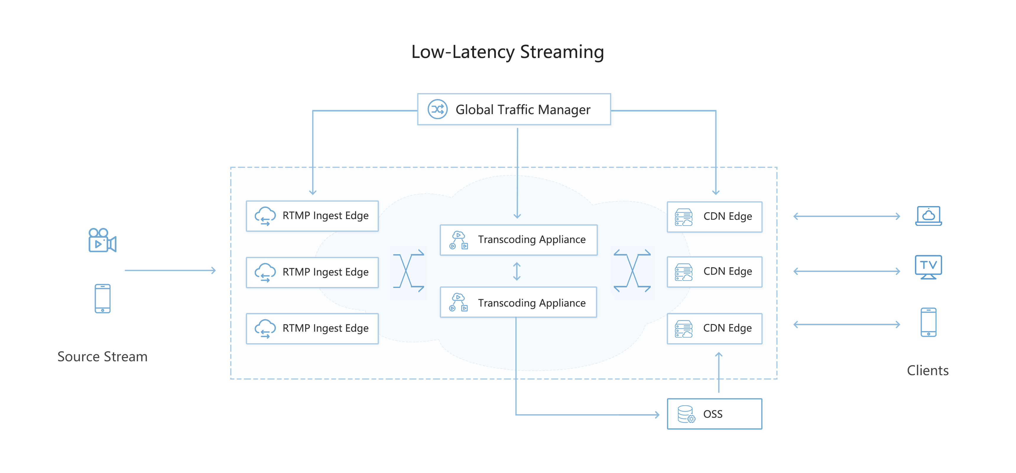 Low-Latency Streaming Solution (LLS) adopts an optimised, low-latency architecture that integrates global ingest, high-performance media processing, and scalable content delivery to support interactive, real-time streaming use cases: