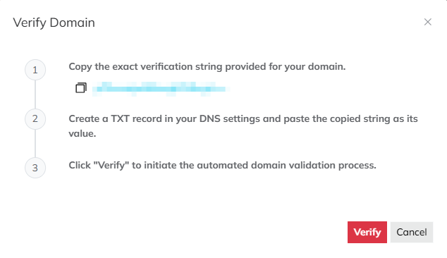 - Go to Domains, select the target domain and click Verify. Copy the verification string.