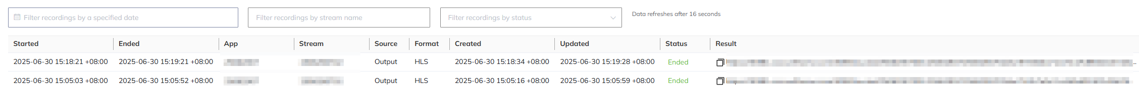 - Acceleration URL of live recording: Go to Recordings. Use filters to find the live recording records. Find and copy the URL from the filter result.