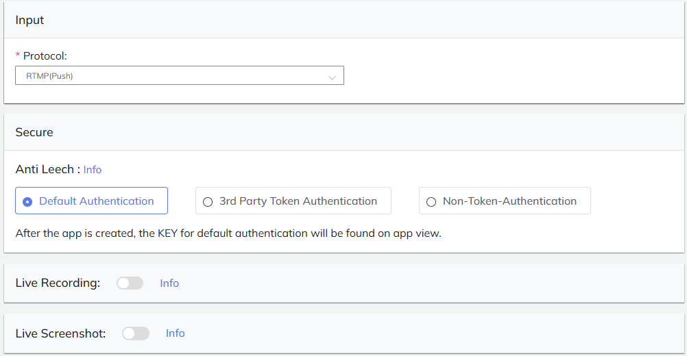 LLS provides stream ingest configuration options, including input protocol, anti-leech protection, and value-added services (VAS) such as live recording and live screenshot.