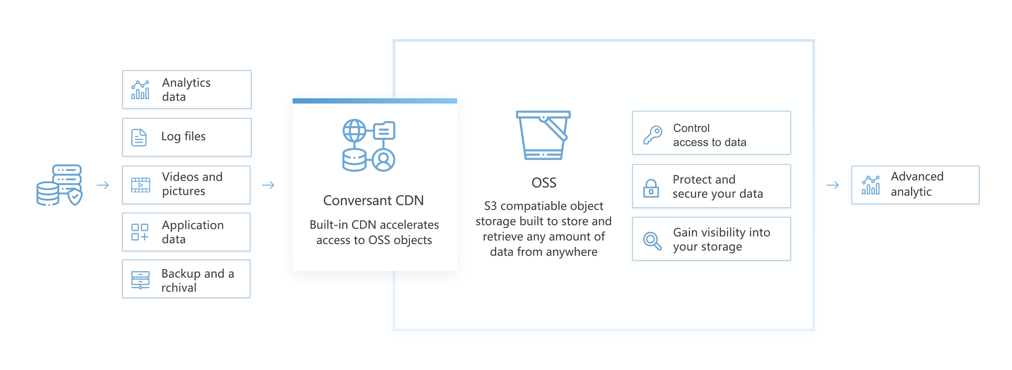 Conversant Object Storage Service (OSS) is a scalable and secure cloud-native storage solution that manages data in the form of objects within logical containers called buckets. It provides a reliable foundation for storing application data, media files, backups, and large-scale unstructured content.